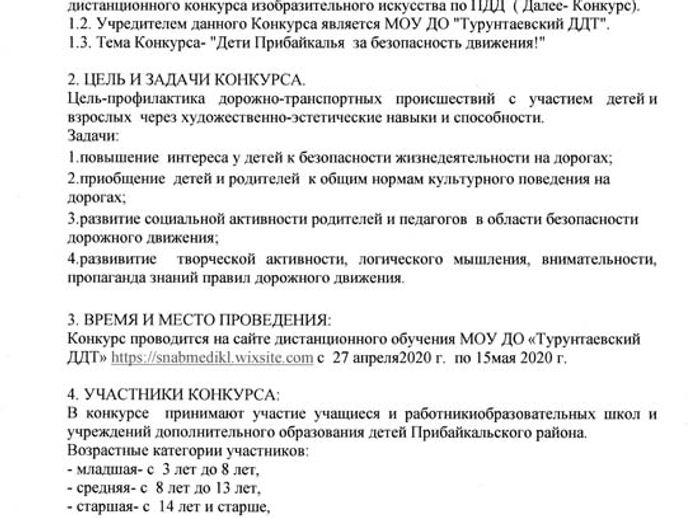 КОНКУРСА ИЗОБРАЗИТЕЛЬНОГО ИСКУССТВА ПО ПДД «ДЕТИ ПРИБАЙКАЛЬЯ ЗА БЕЗОПАСНОСТЬ ДВИЖЕНИЯ!» ссылка на положение: https://cloud.mail.ru/publi...